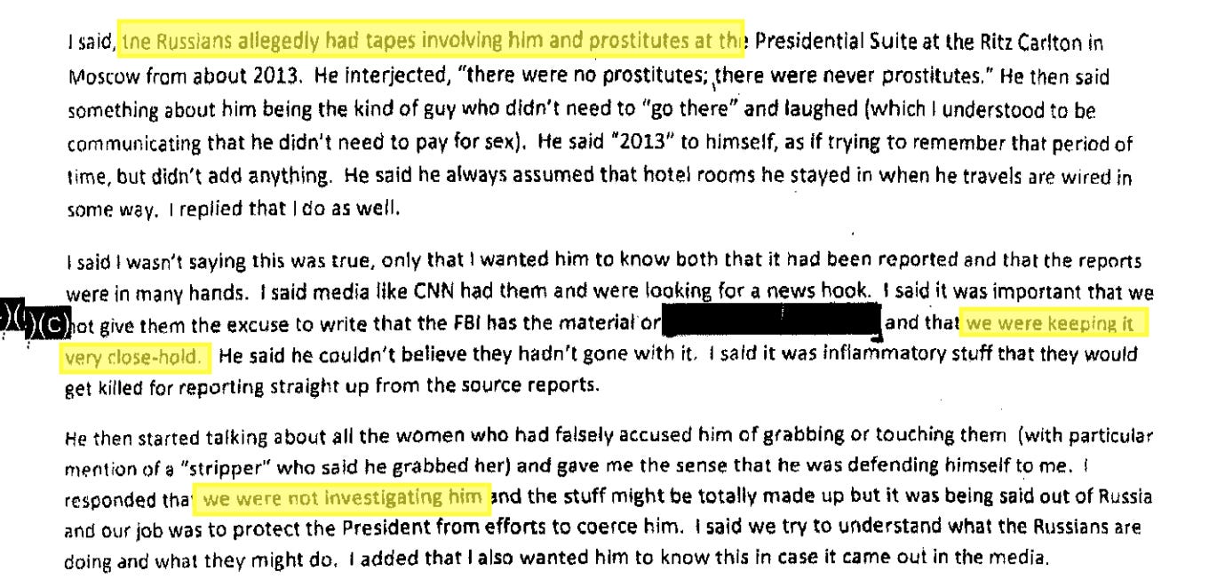 After extensive discussion with my team, I decided I could assure the president-elect that the FBI was not currently investigating him. This was literally true. We did not have a counterintelligence case file open on him. We really didn’t care if he had cavorted with hookers in Moscow, so long as the Russians weren’t trying to coerce him in some way.