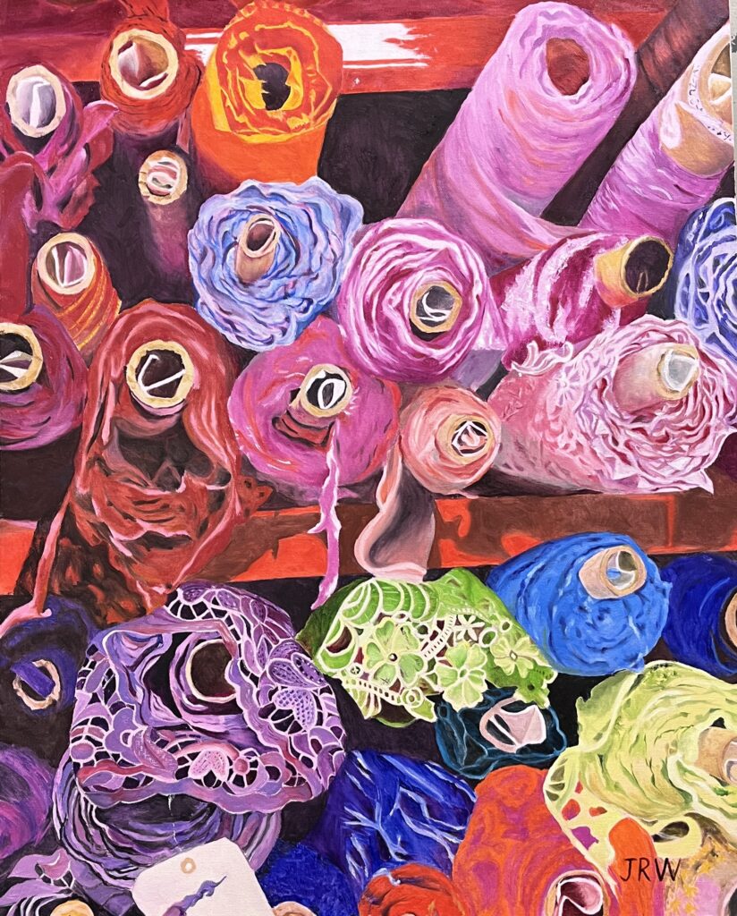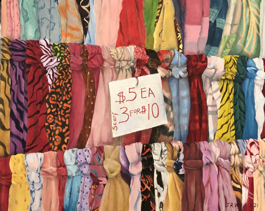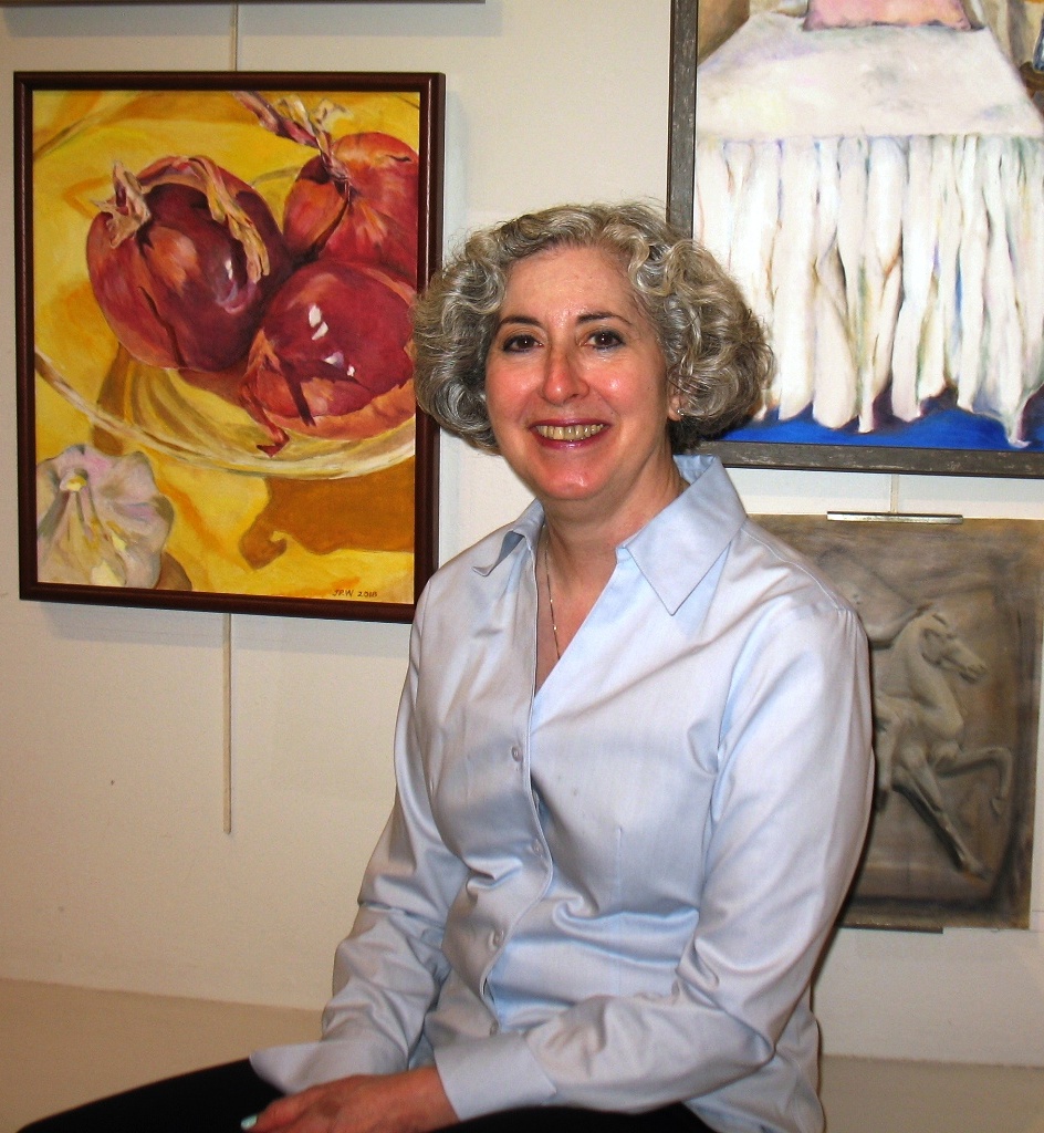 Joyce Weidenaar is a painter and monoprintmaker living in New York City. She began pursuing art ten years ago after retiring from a real estate career. Her works have been seen in solo and group exhibitions, and in private collections. Her paintings are rendered realistically but with unusual framing, bright colors and often a bit of whimsy. Her prints emphasize texture and are purely abstract. Joyce is a member of the National Association of Women Artists, Pleiades Gallery, The Art Students League of New York and the West Side Arts Coalition. Her paintings and prints are viewable on Instagram (@joyceweidenaar) and on her website (http://www.joyceweidenaarartworks.com). Her gallery talk at the Port Washington Public Library can be seen here. In addition to her art endeavors, Joyce is an avid ballroom dancer and skier.