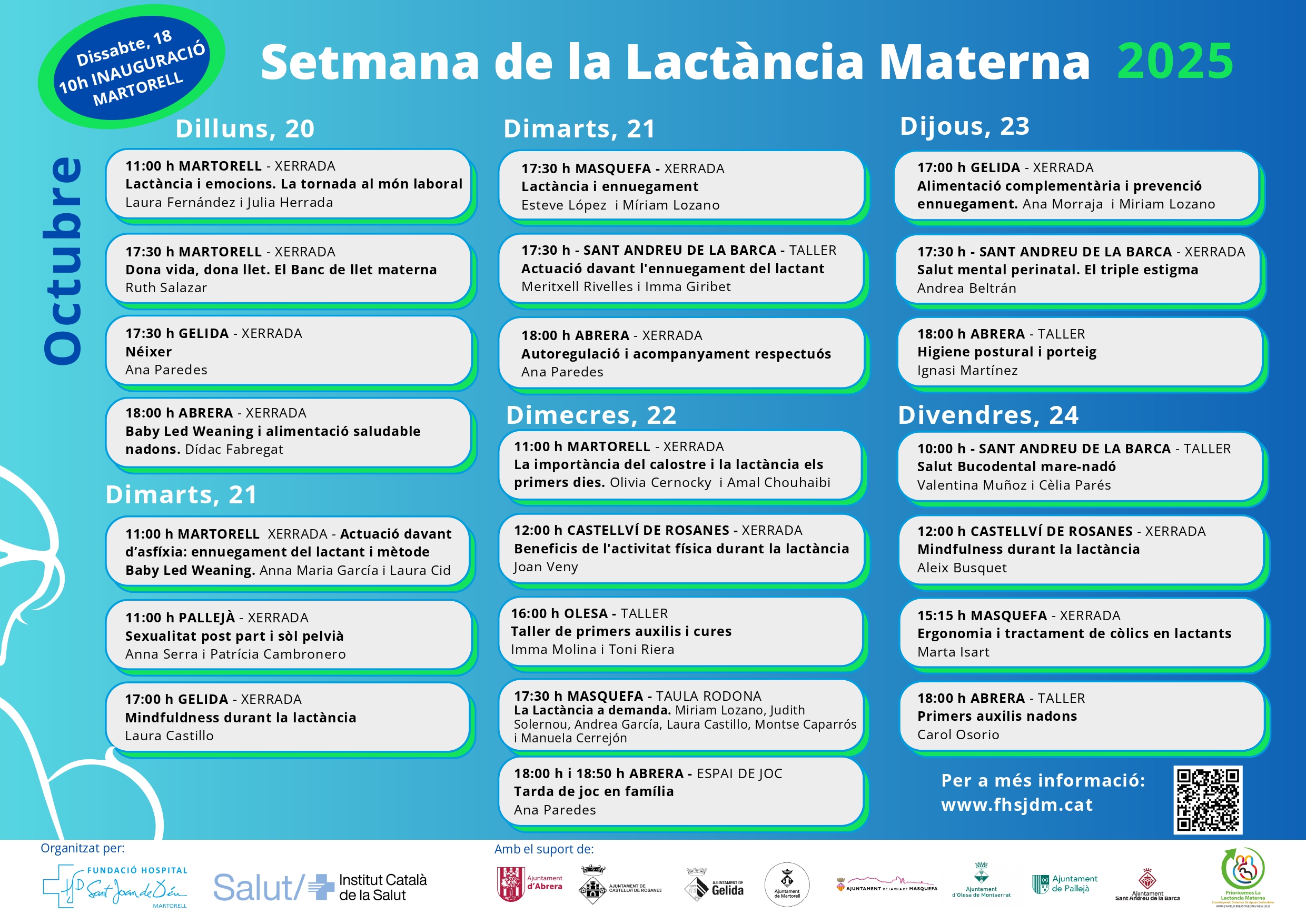 Totes les activitats són gratuïtes, però requereixen reserva prèvia a entrades.martorell.cat. El programa complet de la Setmana de la Lactància Materna es pot consultar a www.fhsjdm.cat.