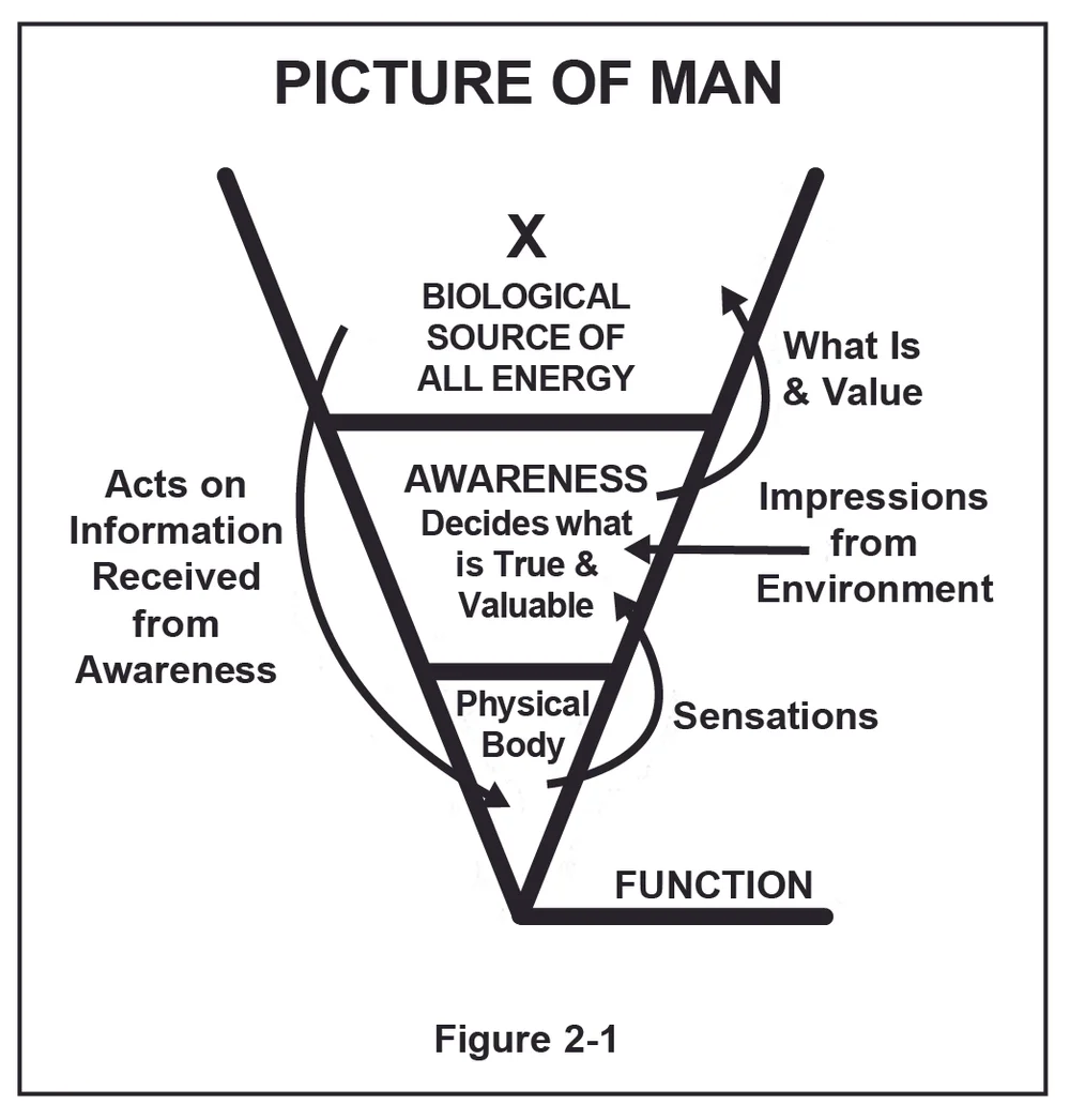 We will label these four things. In the closed portion at the bottom put PHYSICAL BODY. This represents the physical body. Label the middle portion the AWARENESS. That is the awareness function of the human being. Above the second line above the area labeled awareness put an X in the space, that no matter how far you extend those two lines that would still be X. It is the unlimited aspect of mind. The awareness is limited and the physical body is limited. From a circle drawn around this (the V) which represents, and label, the ENVIRONMENT, draw a line from the environment into the awareness. Draw another line from the physical body into the awareness. Put two arrows on the lines coming into the awareness, one from the environment and one from the physical body. Both of these will be labeled. On the one coming from the environment, write impression on it. One the one coming from the body, write sensations. All of them really are sensations because they do go through the body to get to the impressions, but certain ideologies we formed from the environment without necessarily having a sense of it first. There are impressions and sensations constantly impinging upon the awareness.