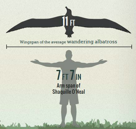 <figcaption class="wp-caption-text">Wingspan of a wandering albatross compared with basketball great Shaquille O’Neal, image from: Discovery https://twitter.com/discovery/status/181491161293275137</figcaption></figure>Currently, the main threat to the albatross is fisheries; albatrosses are commonly caught on longline hooks when they chase bait meant for large fish before it has sunk. Invasive species are also impacting Albatross breeding sites; rodents often eat the eggs of albatrosses and destroy nesting areas. The Wandering Albatross is currently listed as vulnerable by the International Union for Conservation of Nature.