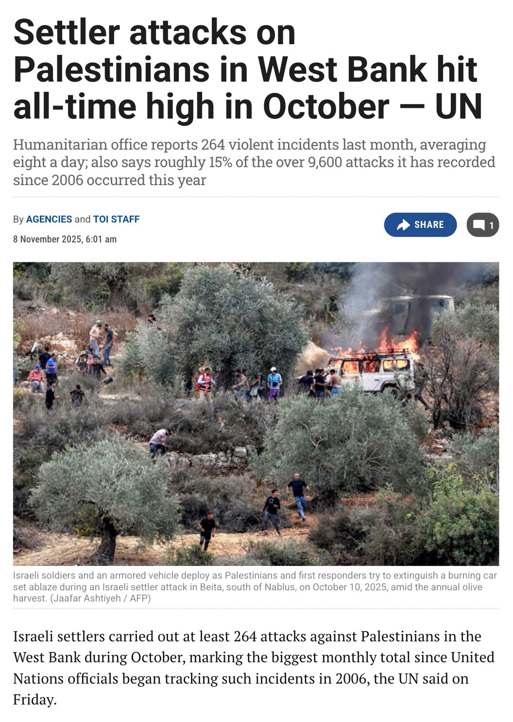 Hundreds of Israeli settlers attacked Huwara and three nearby villages, torching hundreds of Palestinian homes, businesses, a school, and numerous vehicles. One Palestinian man was shot dead and 100 Palestinians were injured, four critically. Despite the intensity of the attacks, six arrested suspects were released by Israeli police, and two others were issued administrative detention orders.