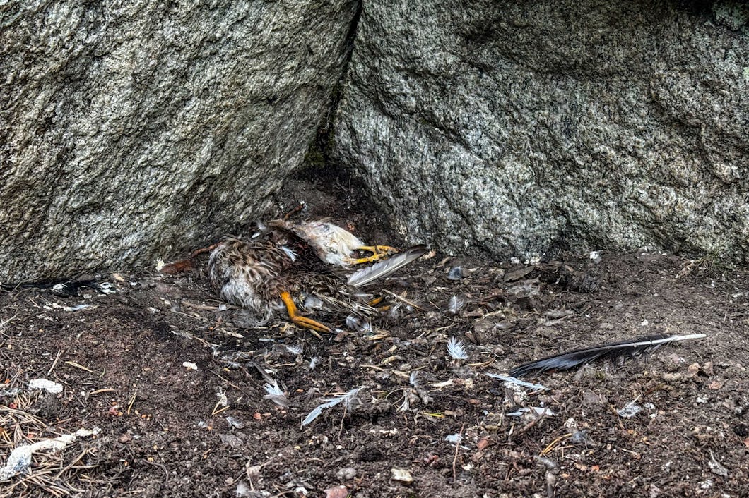Det finns ingen unge i bohyllan, men det ligger färska byten där. På bilden syns bland annat delar av en kricka och en tornfalk, samt fjädrar från en hornuggla och en korp. Foto: Emil V. Nilsson.
