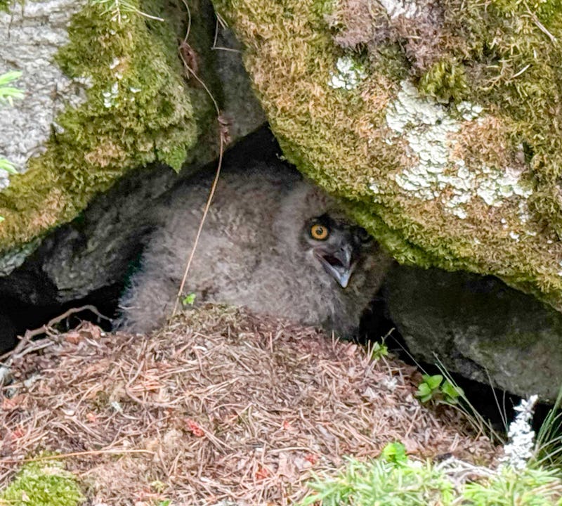 När vi kommer fram till bohyllan så finns det ingen unge där, men gott om färska byten. Berguven är toppredator och på dess boplatser har det hittats rester av alla andra ugglor, men även rovfåglar. Samtidigt är brunråtta och vattensork vanliga byten i andra revir än det här. Så vi letar runt, tittar i bergskrevor och under enbuskar. Plötsligt ropar Baltasar till:
