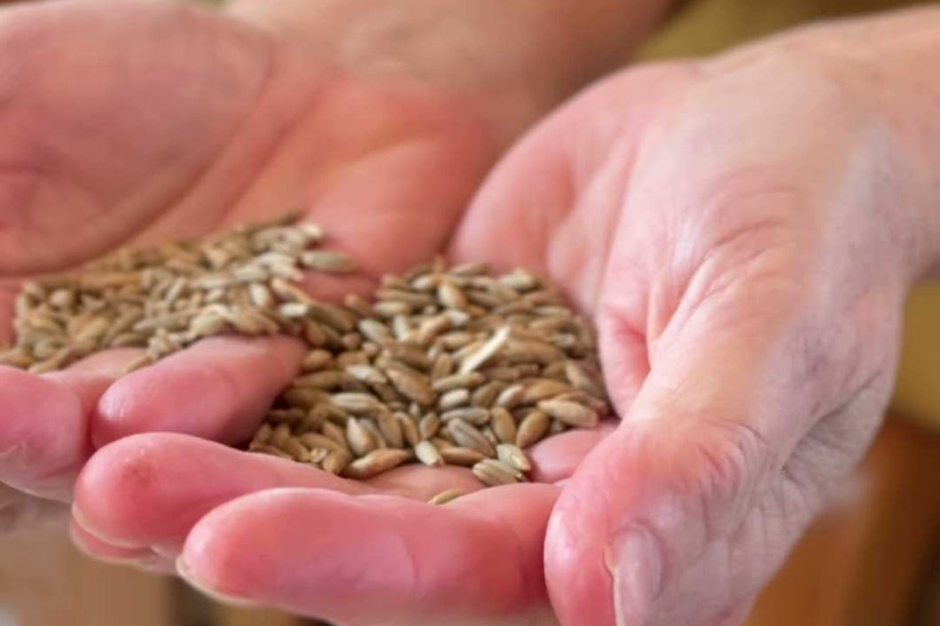 Karin Gerhardt visar upp kärnor (gräsfrö) av Dala lantvete och Ekhagavete som odlats av henne grannar på lantbruket Åhls grönt. Foto: Emil V. Nilsson.