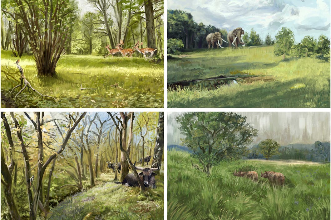 Det landskap som fanns i Europa före den senaste istiden, under tidsperioden Eemian när klimatet var liknande dagens, utmärktes av öppna och halvöppna marker med hassel och ekar. Dovhjortar, skogselefanter, uroxar och noshörningar bidrog till att hålla landskapet öppet. Illustration: Brennan Stokkermans, från Pearce m. fl. (2023) CC-BY 4.0.