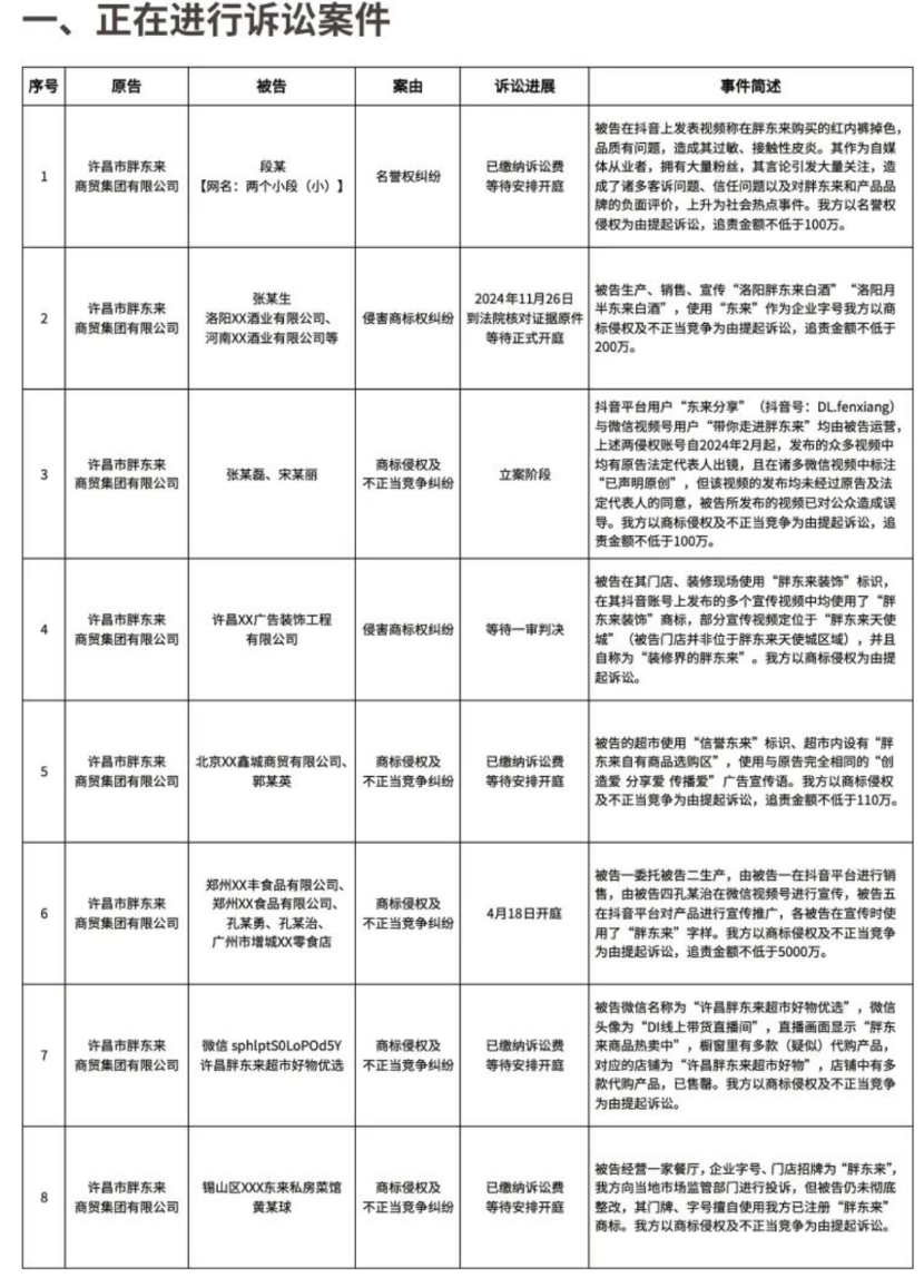 胖东来2025年4月公布的7项正在进行诉讼的案件和9件拟起诉案件