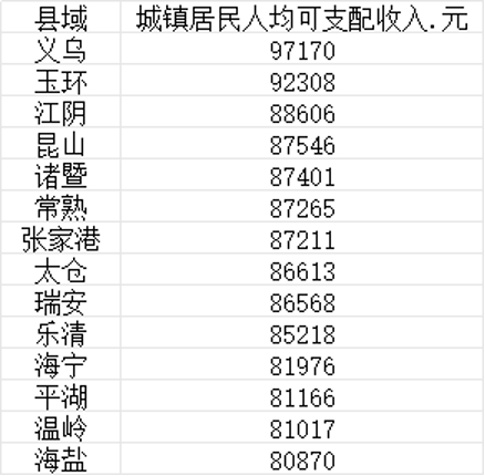 中国县域城镇居民人均收入的榜单