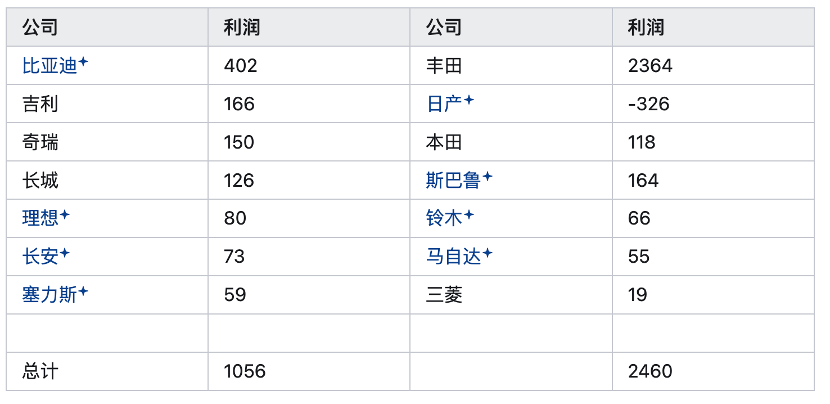 过去一年部分日系和国产汽车利润对比