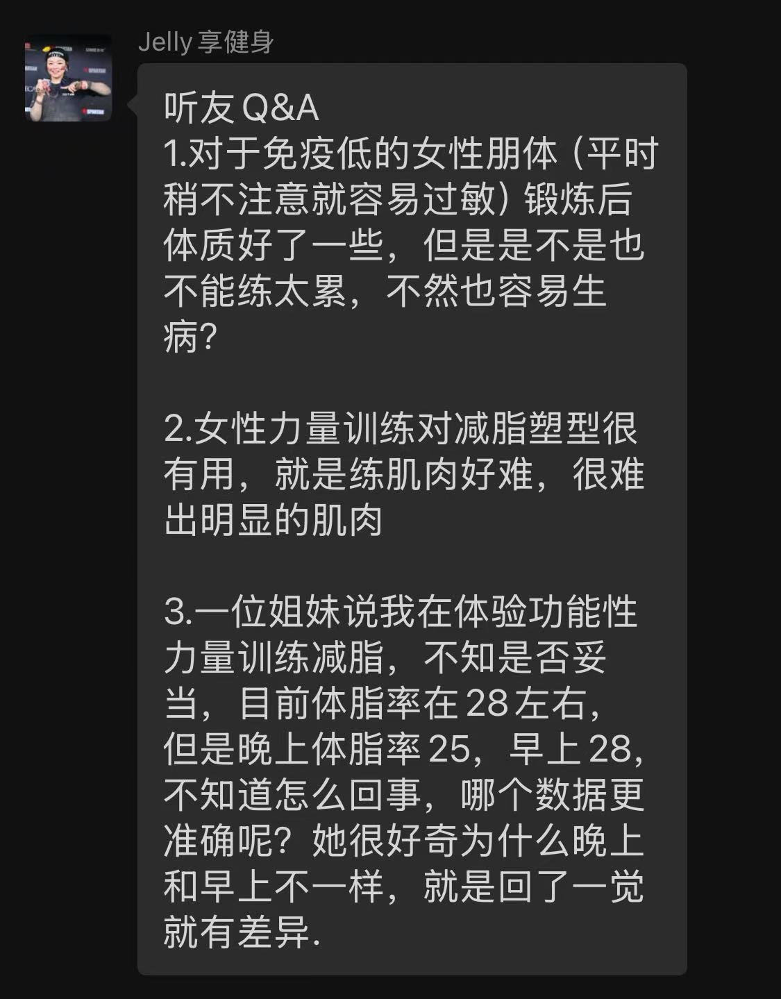 此外,晓东老师还解答了关于女性塑形与体脂率的疑问,强调了合理的训练方法与饮食对健康的重要性。