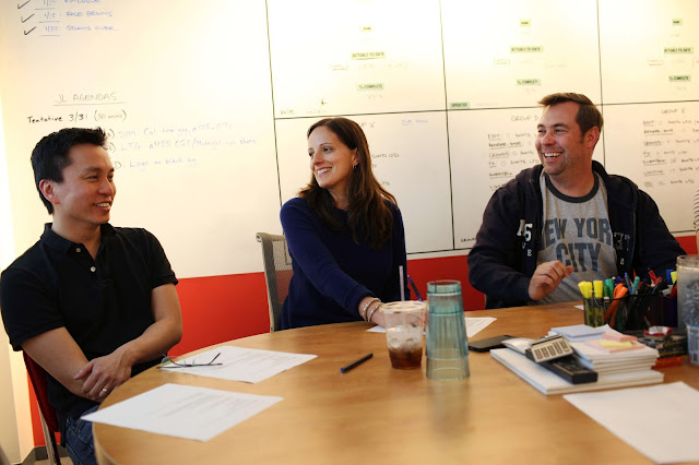 | Michael Fong, Andrea Warren and Brian Fee at a production meeting |