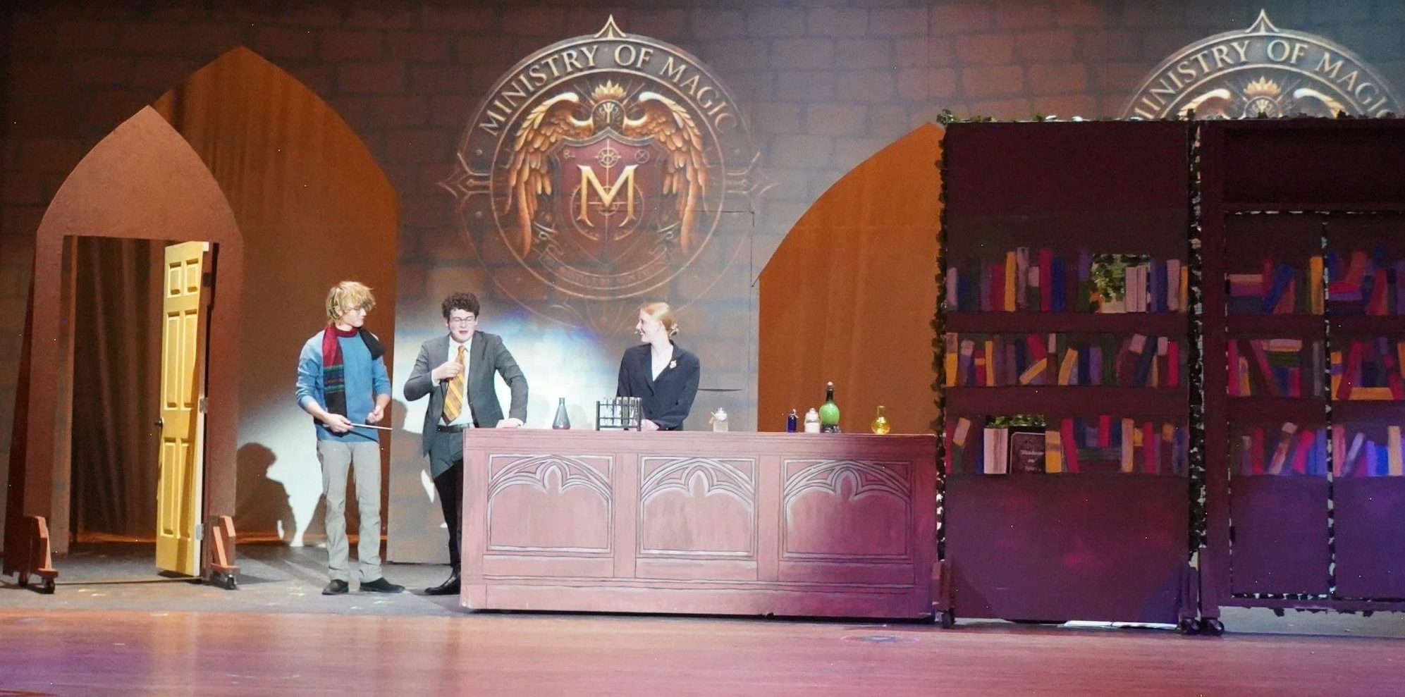 <figcaption class="wp-element-caption">Gavin Nations, from left, with Henry Billinghurst and Adah Wiese portray the famous trio of friends, Ron Weasley, Harry Potter and Hermione Granger in ‘Harry Potter and the Cursed Child, High School Edition,’ at Summit High School in November 2025.</figcaption><figcaption>Matt Renoux/Summit High School’s Performing Arts Department</figcaption>