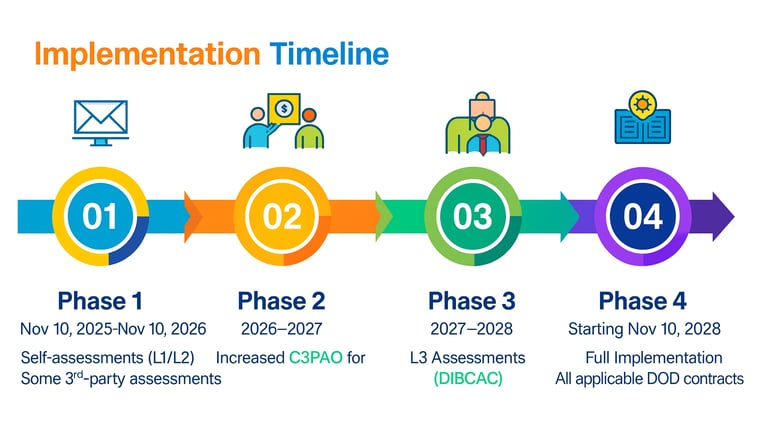The Department of Defense’s Cybersecurity Maturity Model Certification (CMMC) program is moving from planning to execution. With the Final CMMC Acquisition Rule now published, contractors across the Defense Industrial Base (DIB) must prepare for phased implementation beginning November 10, 2025. Understanding the timeline is critical for primes and subcontractors alike to avoid compliance gaps that could impact contract eligibility.