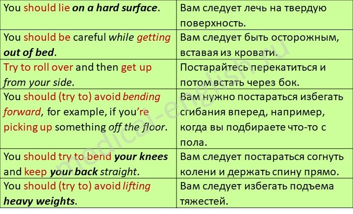Задание 8. Изучите дополнительные инструкции, которые физиотерапевт дает пациенту с болью в спине: