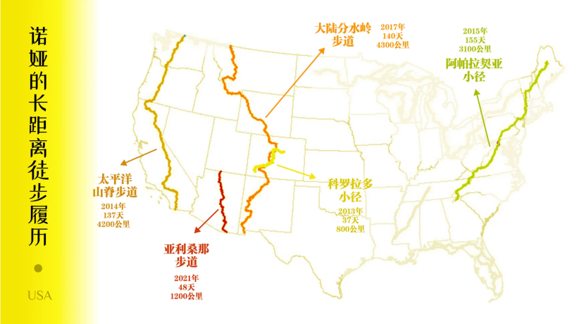 2015年,张诺娅用时155天,从佐治亚走到缅因,从斯布林格山走到卡塔丁,完成了世界长距徒步路线的始祖–3500公里的阿帕拉契小径。