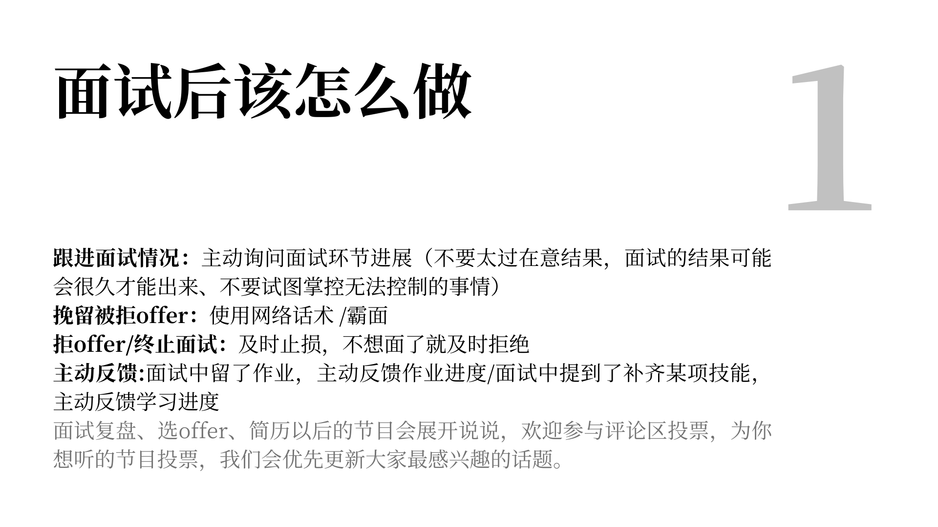 面试中遇到没准备的题目该如何回答?哪些面试必杀技可以帮我们脱颖而出?被面试官压力/打断了怎么办?有哪些肢体语言可以增加面试的亲和力?本期内容我和小谢将围绕面试中和面试后环节,展开分享每一步的注意事项和攻略技巧,希望可以帮助大家在春招斩获心仪的offer!如果对面试前内容感兴趣的话,欢迎收听上一期内容~上一期节目链接-点击即可跳转播放