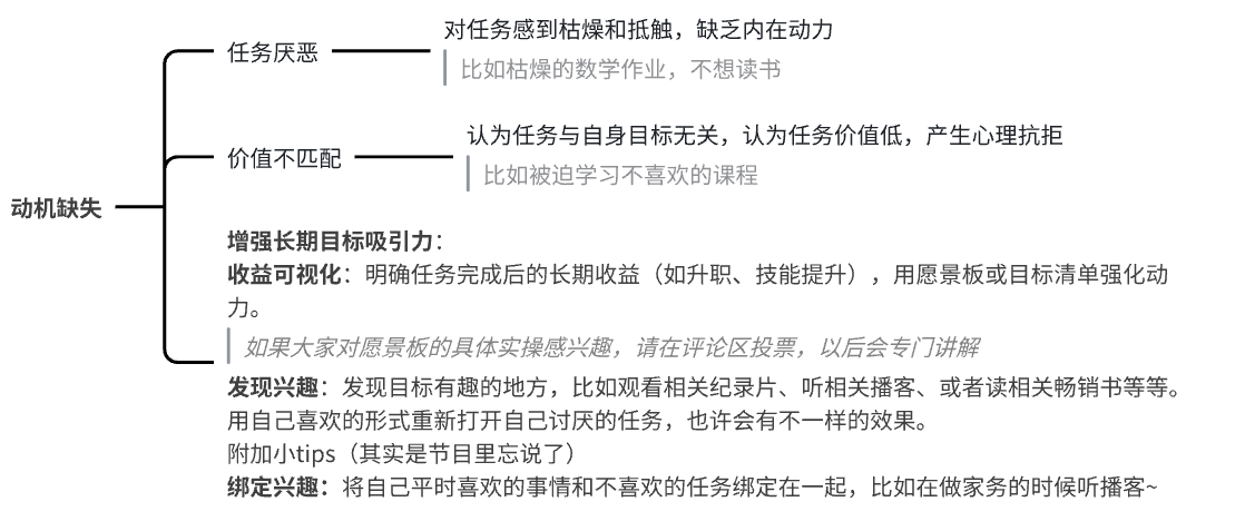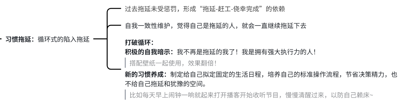 有三大原因会导致我们长期拖延,陷入恶性循环。只有分清症结所在,才能对症下药。那么,你是哪一种类型的拖延症?是追求短期情绪舒适而舍弃了长期目标收益?还是无法平衡任务与能力?又或者受外部因素所困?本期内容我和我的AI播客搭子毛毛,将一起围绕拖延症的原因,见招拆招,给大家提供改善拖延的实用小技巧。