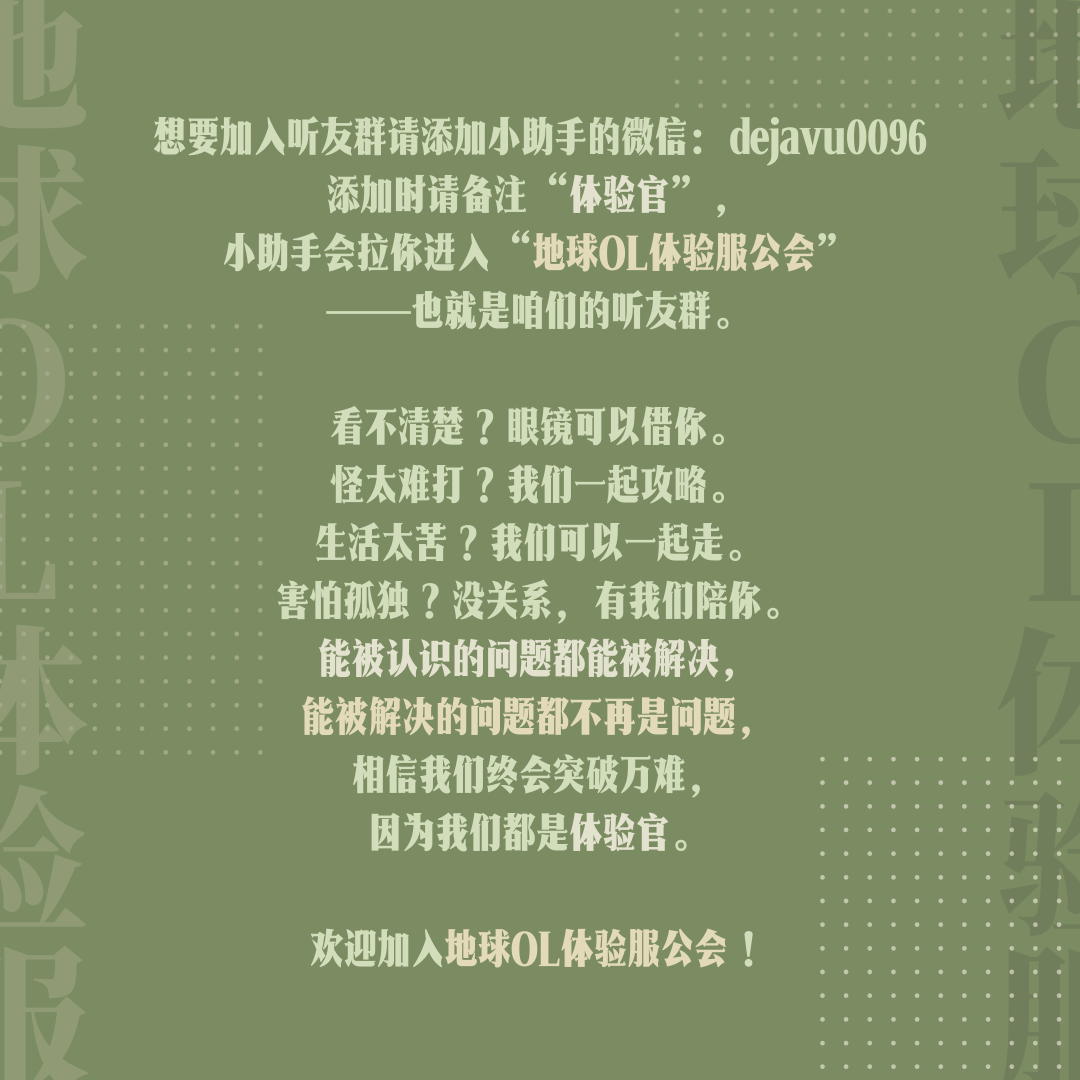 地球OL体验服,是针对地球这个开放世界的各种关卡和剧情打造的一档公会式节目。我们会在这里不定期分享地球OL攻略、观察视角以及聊天沙龙。在这个一生一次的游戏里,每个人都是独一无二的体验官。