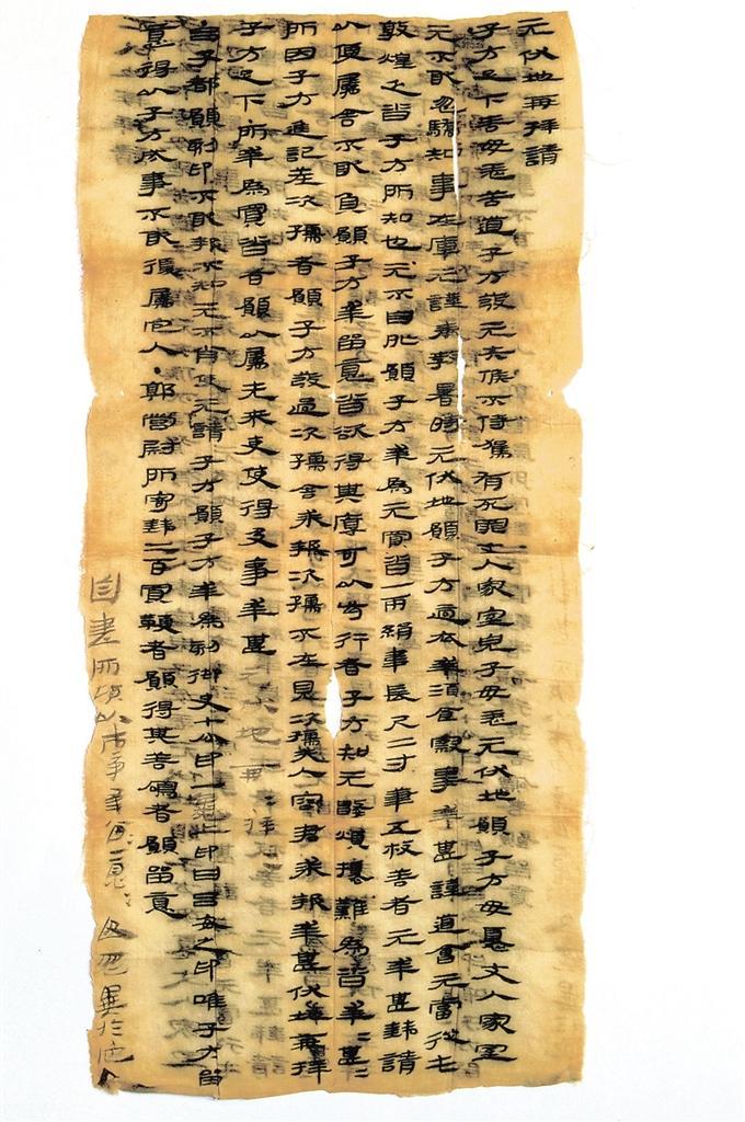 元致子方书:甘肃简牍博物馆馆藏的西汉晚期帛书书信,1990年出土于敦煌悬泉置遗址,为国家一级文物。该信由戍边军官「元」写给友人「子方」,共10行319字,为现存字数最多、保存最完整的汉代私人信件实物。信件内容包含四项委托:代购皮履与毛笔、问候次孺夫妇、代刻龟钮印章「吕安之印」、代购响鞭,涉及边塞军官物资补给与社交往来细节。信中提及的绢鞋尺寸(汉制尺二寸)与物品需求,反映了汉代丝绸之路驿站悬泉置的商贸活动及戍边人员生活状态。