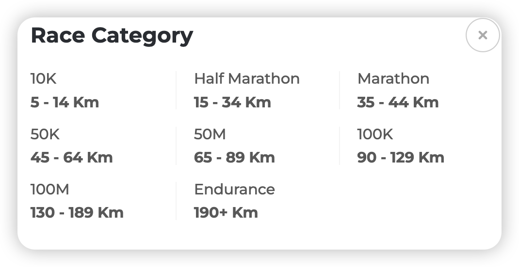 另外,很多新手会遇到各种问题,比如:赛事明明是47公里,为啥实际跑下来却有50公里,越野赛这么不精准吗?再比如:为啥实际爬升只有1500,但比我之前1800的爬升要虐多了?只看爬升究竟能否判断越野赛难度?本期节目,我们会详细帮大家解答这些看似司空见惯,却一直困扰着我们的问题。(下图是ITRA积分赛事中,不同组别对应的距离范围)