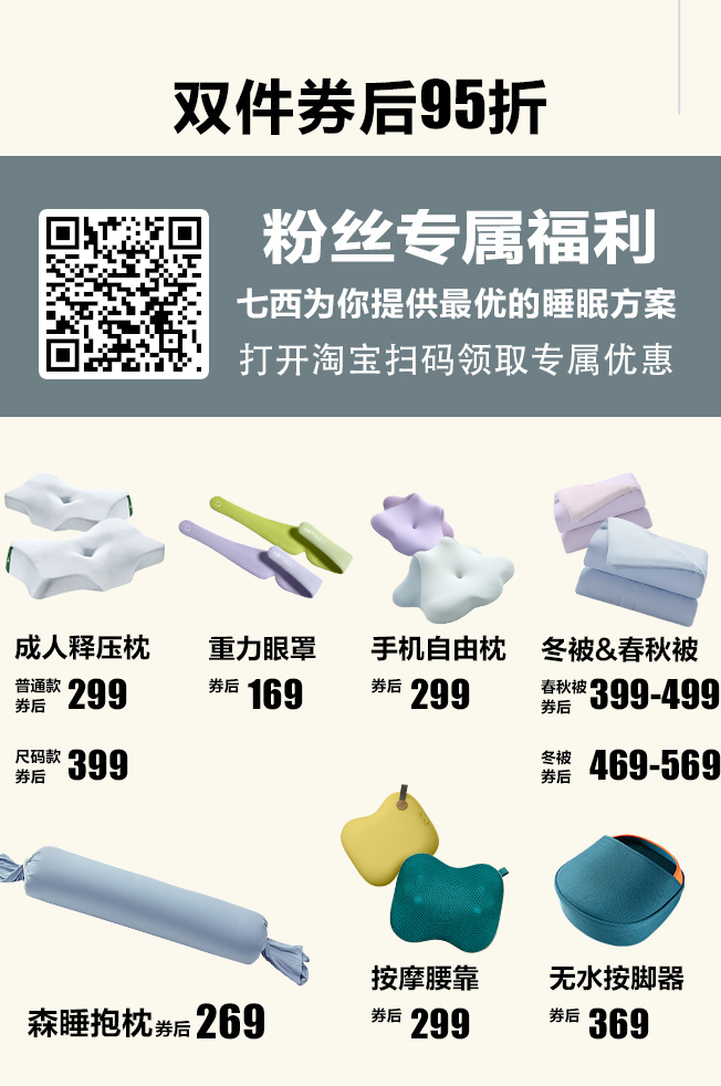护颈助眠的「七西枕头」不仅可以有效缓解颈椎疲劳,快速帮助进入深睡眠状态;还根据人体工学设计,更适合颈椎生理曲线,不会让你睡醒肩颈酸痛,落枕,实现翻身自由,独特的分码设计可以根据人体的身高体重,头围肩宽选择适合自己的睡眠枕,平时睡不好,肩颈不好的可以去了解看看。