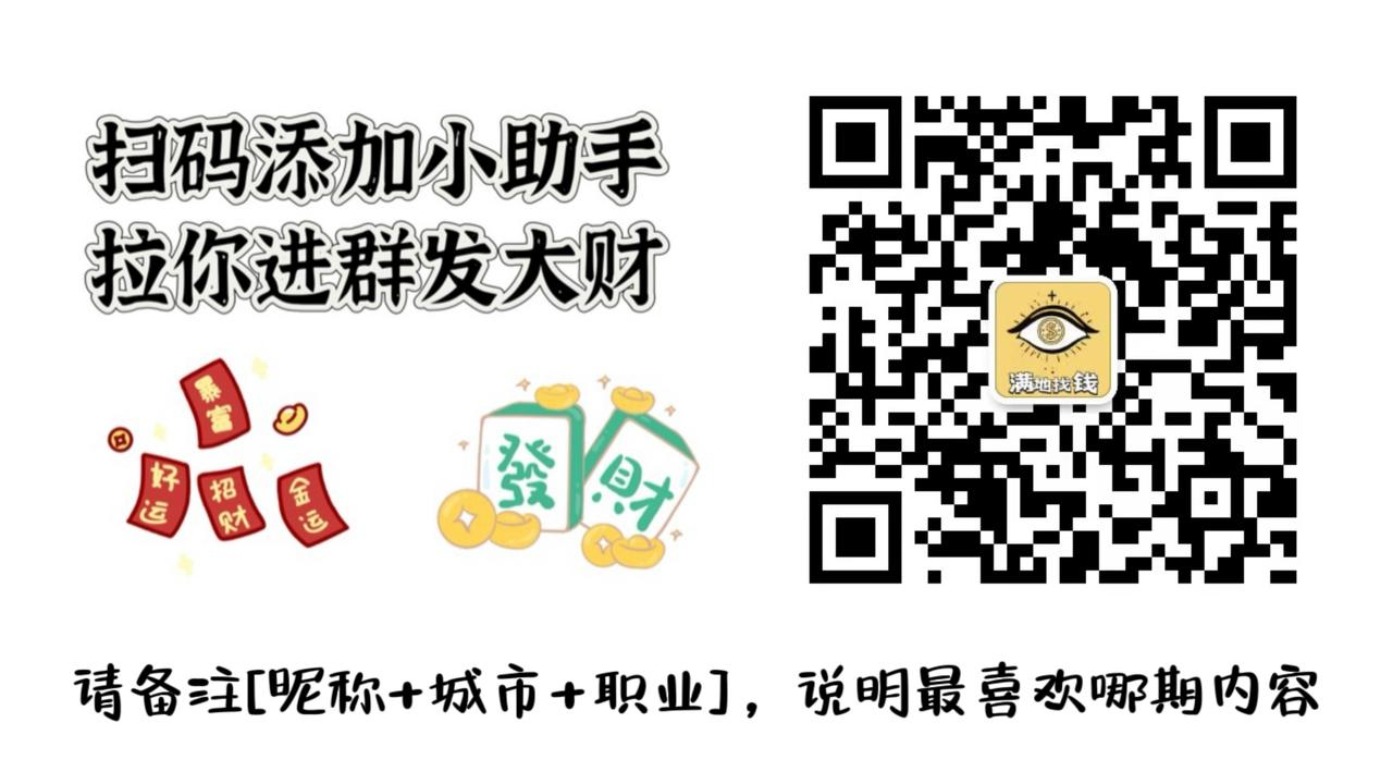 搞钱的路会有艰难,抱团走过会更简单。想要加入满地找钱听友群的朋友,或者是想与满地找钱展开商务合作的个人/品牌方,请添加小助手微信:钱钱(Morethan100w)、财财(MoreThan-100w)