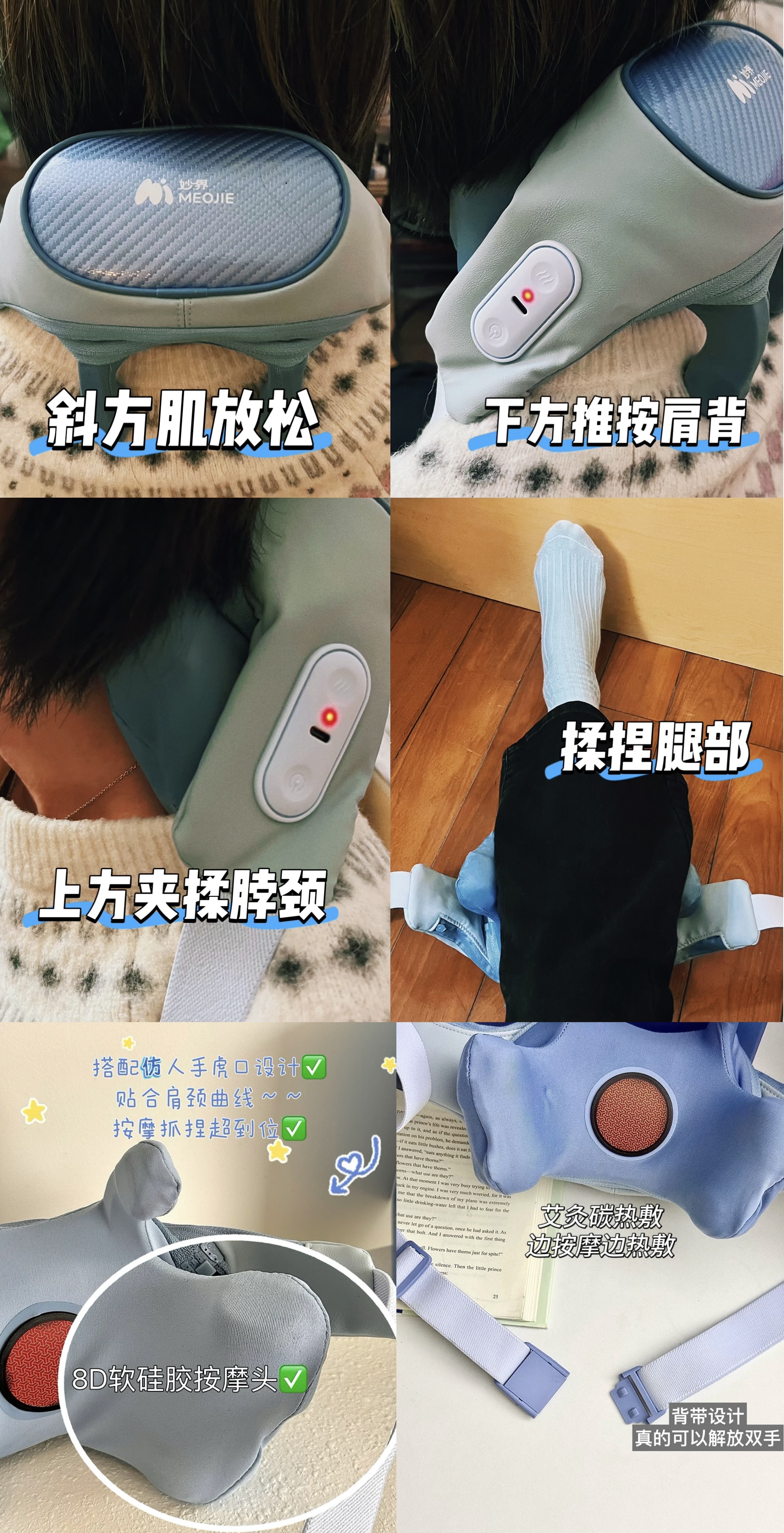 推荐一款狐狸和达西最近常用的放松小物——妙界R3肩颈按摩仪至尊升级款。它有仿人手虎口揉捏的设计,8D按摩头,夹揉脖颈、推按斜方肌,酸爽又放松;肩带式无线设计让双手完全解放,一边读书、一边按摩都不耽误;
