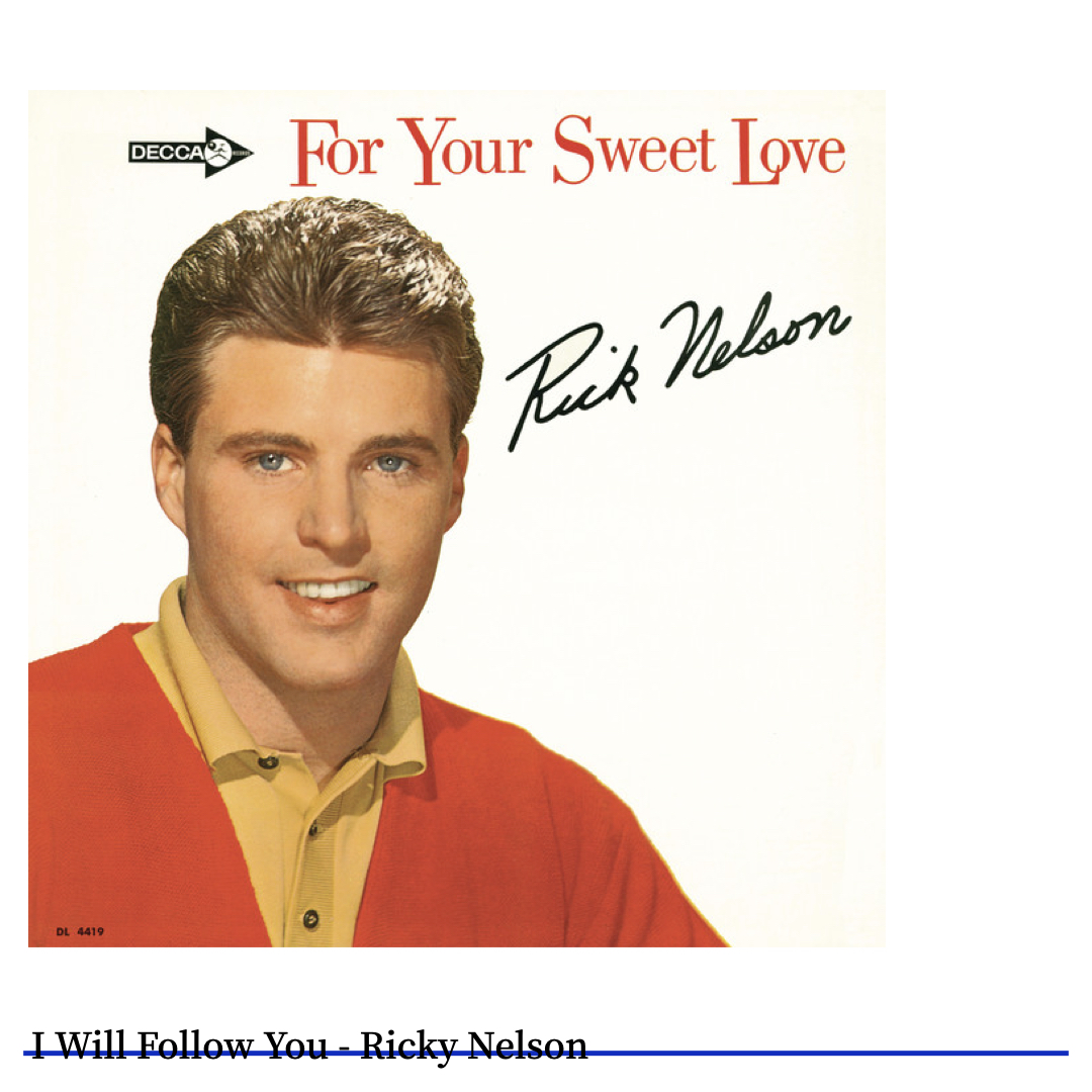 其实我们可以生活在所有时空里,这一刻,一首1963年的歌突然成为我情感的一部分,I Will Follow You,演唱者 Ricky Nelson 于1949年进入娱乐业,那一年我父亲出生,他们活在同一个时空,但命运是多么不同。