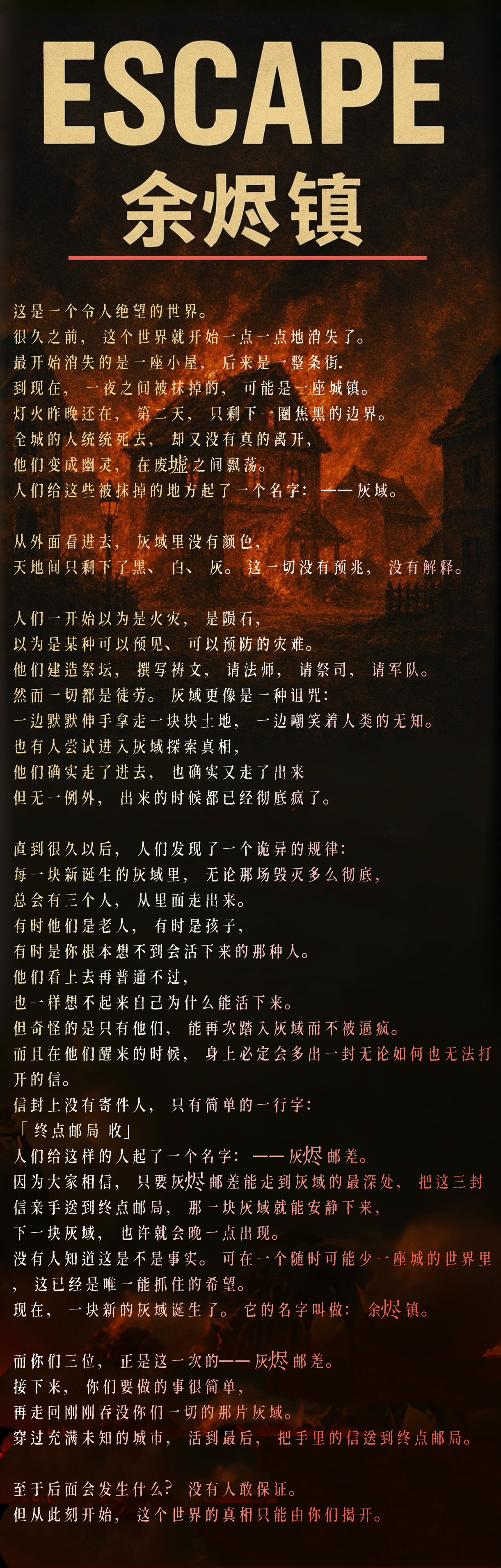 故事发生在一个叫余烬镇的镇子里,三个玩家扮演“灰烬邮差”,需要齐心协力把手中的信,送到终点邮局。