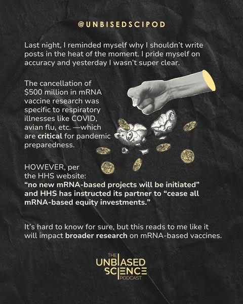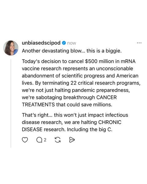 We messaged each other on Tuesday with just three words: "Did you see?" We both knew what the other meant. After years of explaining to friends and family that yes, mRNA has always been in their bodies, and no, it doesn't change your DNA, we watched as nearly half a billion dollars in research funding vanished with the stroke of a pen (rather, a ‘key’).