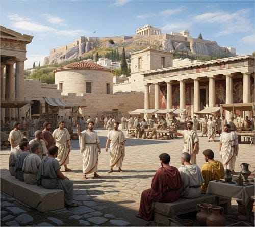 The name itself derives from “agora” (ἀγορά in Greek), which is generally translated as “marketplace.” But the ancient Greek agora was not merely a marketplace in the crass sense of our modern understanding of that word. It was a public square, a gathering place where people could exchange not only goods but also ideas. A place where they could cooperate, argue and καταλλάσσω (katallassó), i.e., not just exchange goods or ideas but engage in the reconciliation that forms the basis of human society.