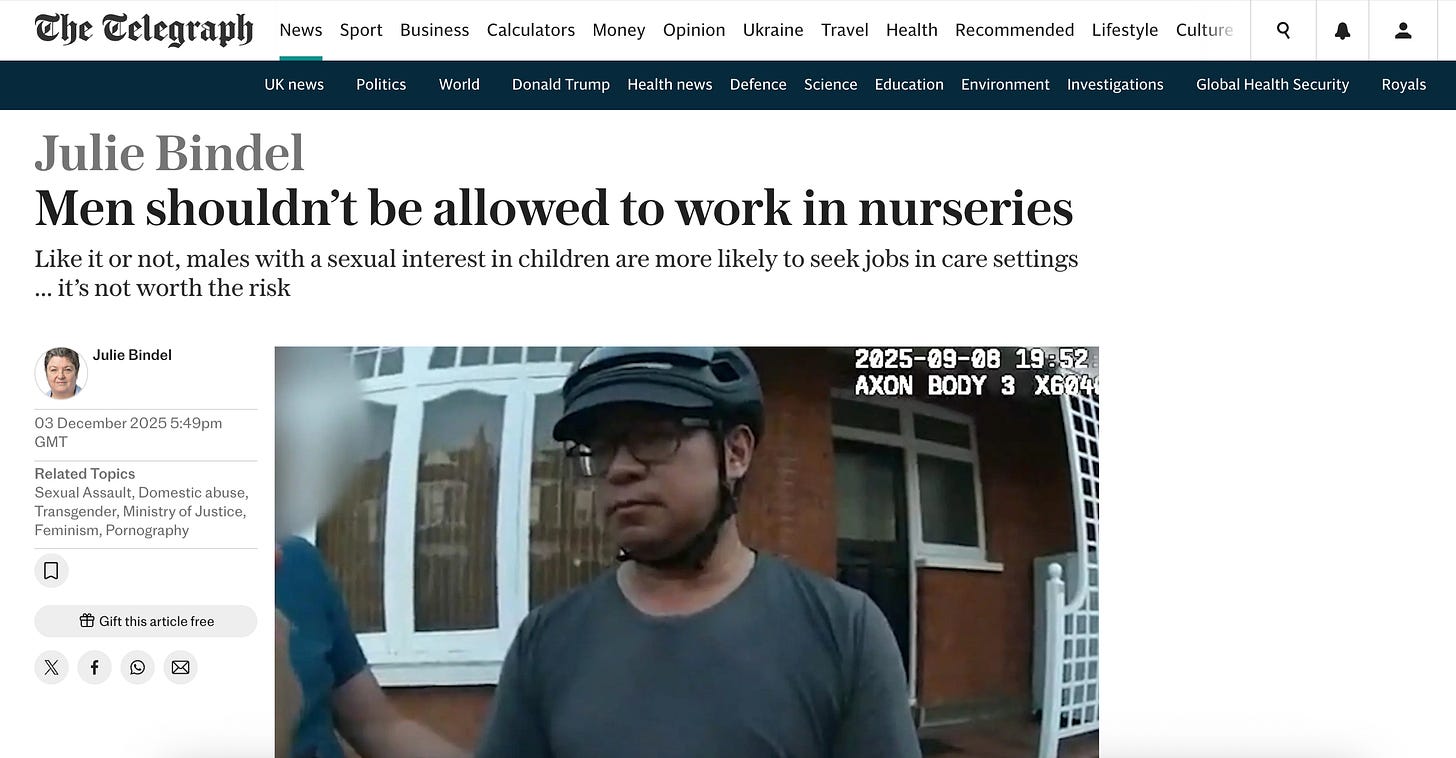 How interesting then to see such pushback against a piece I wrote, published in the Telegraph on the 3rd of December. It was pegged on the terrible case of Vincent Chan, a male nursery worker who this week pleaded guilty to 26 charges relating to sexual assault offences against children, as well as the taking and making of pornographic images, five counts of sexual assault of a child by penetration, and possession of images depicting the most extreme and severe abuse of children. Chan is one in a long line of men who have worked directly with young children and been found guilty of sexual abuse against them. Only last year, Thomas Waller was convicted for raping and sexually abusing children as young as three at a nursery. There are many, many more.