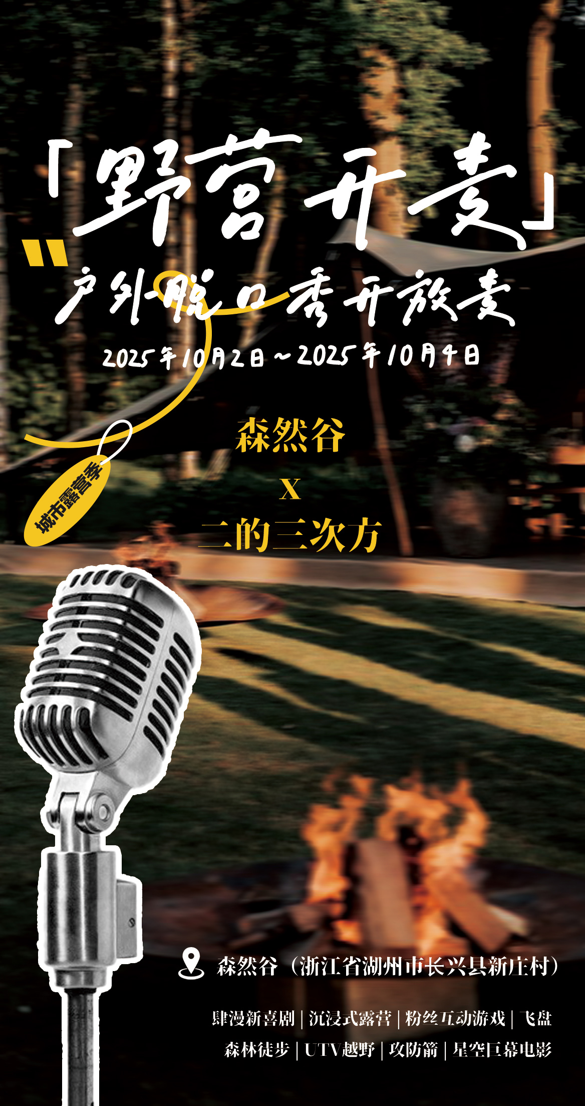 湖州森然谷是一个集成式户外基地,距离上海自驾车程两小时,涵盖多形态露营、户外徒步、越野、竞技玩乐,国庆期间,10.2-4号每晚19:00-20:20,还会有全新肆漫新喜剧沉浸式互动专场演出,扫描shownotes里的二维码,购买露营套票,与二的三次方主播们和肆漫新喜剧的演员们,一起度假一起玩~
