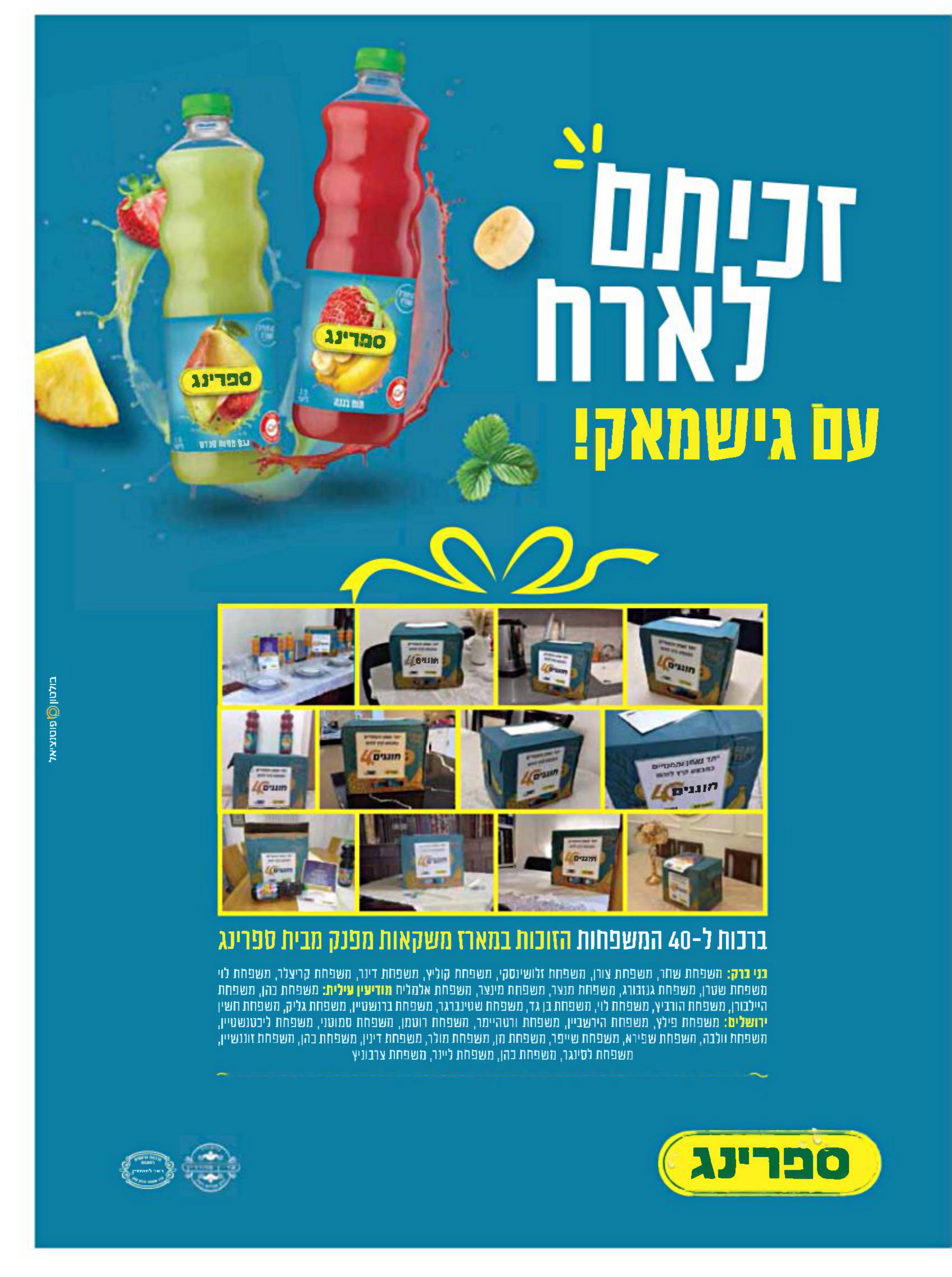 בתחום המשקאות, 'ספרינג' המשיכו בקמפיין השפה האחידה שלהם – 'גישמעק' בהובלת משרד הפרסום 'בולטון פוטנציאל', ופרסמו מודעות “מזל טוב ל-40 המשפחות” שזכו במבצע שהתקיים בתקופת החגים, כולל הצגת תמונות הזוכים. החיבור בין הבטחה לבין מימוש בפועל תרם לאמינות המותג ולנראותו החיובית.