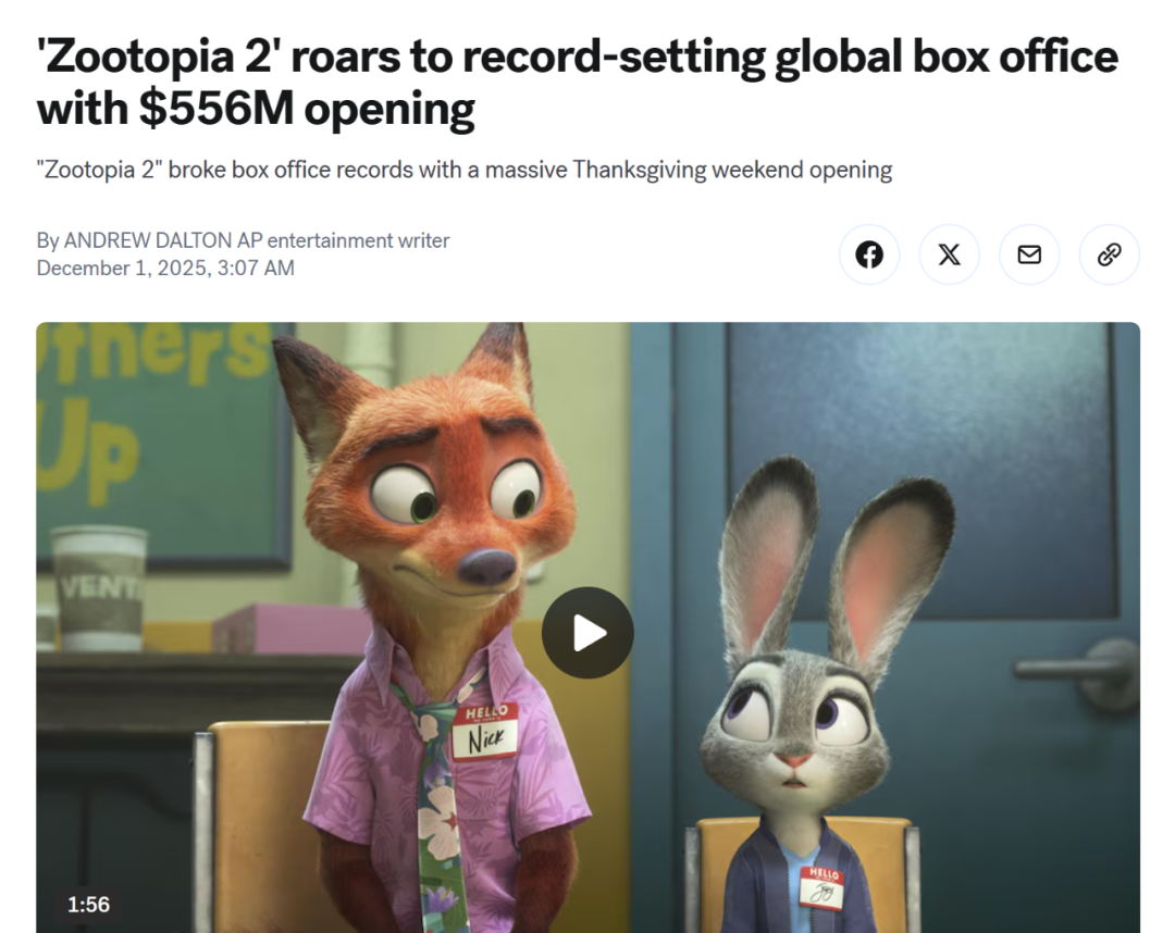 'Zootopia 2' roars to record-setting global box office with $556M opening