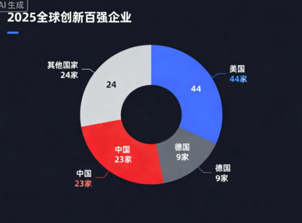 美国以44家企业占据全球创新百强近乎半壁江山,中国以23家紧随其后,两国合计占据近70%席位——而欧洲国家仅德国以9家企业勉强守住第三阵营。