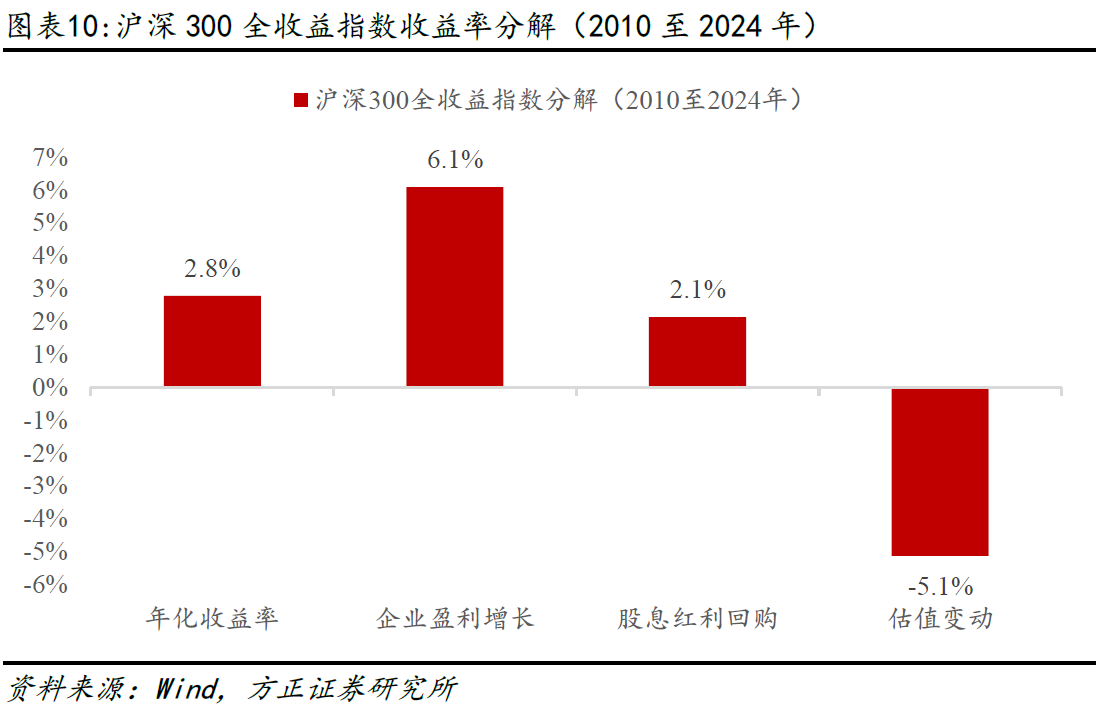 在2010年至2024年期间,沪深300全收益指数实现了2.8%的年化收益率。最大的贡献来自企业盈利增长,该部分为指数贡献了6.1%的年化收益。