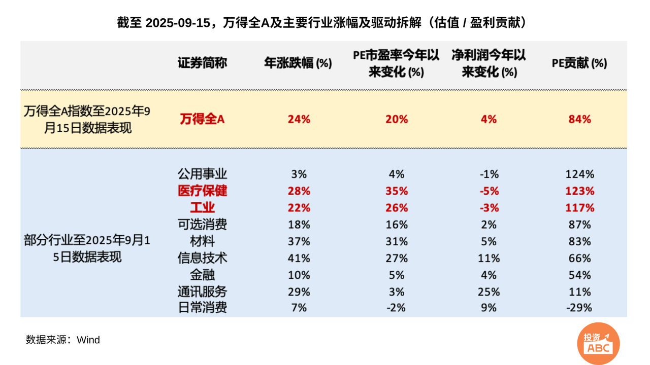 截至2025年9月15日,部分行业的上涨更多依赖投资者对未来政策与需求改善的预期,可进一步观察这些行业(如,医疗保健、工业)的后续盈利变化。