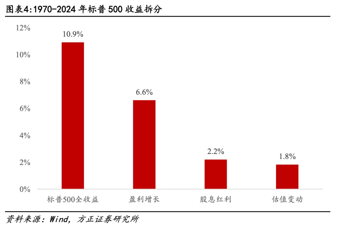标普 500 过去平均年化总回报约 10%,其中约 6% 来自每股盈利增长,为最主要的驱动因素;估值倍数扩张和股息各贡献约 2%。