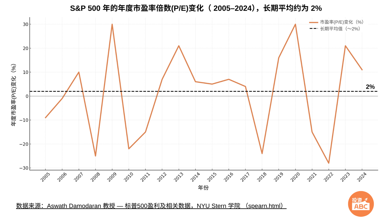 标普 500过去 20 年估值倍数波动较大,但长期平均变化约为 2%。
