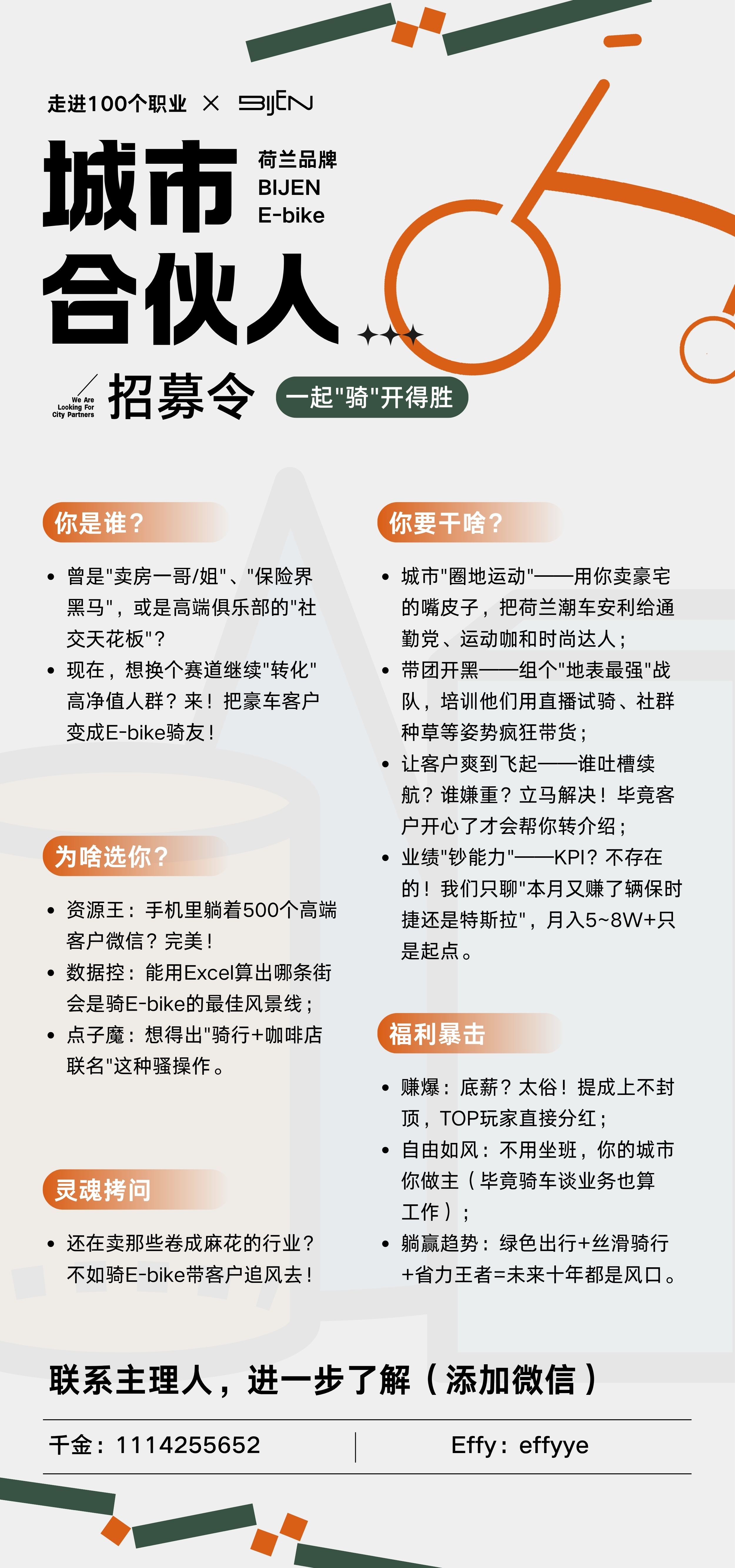 想加入百迎的品牌推广大使or城市合伙人计划,不坐班get副业收入吗?想成为百迎的经销商,轻资产撬动创业机会,一起开拓国内高端电助力车市场吗?