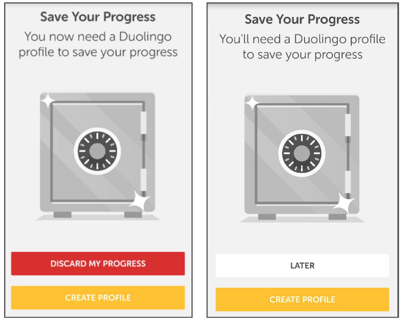 最初的注册页面(左),放弃按钮十分显眼;更改后(右),把放弃变为推迟注册