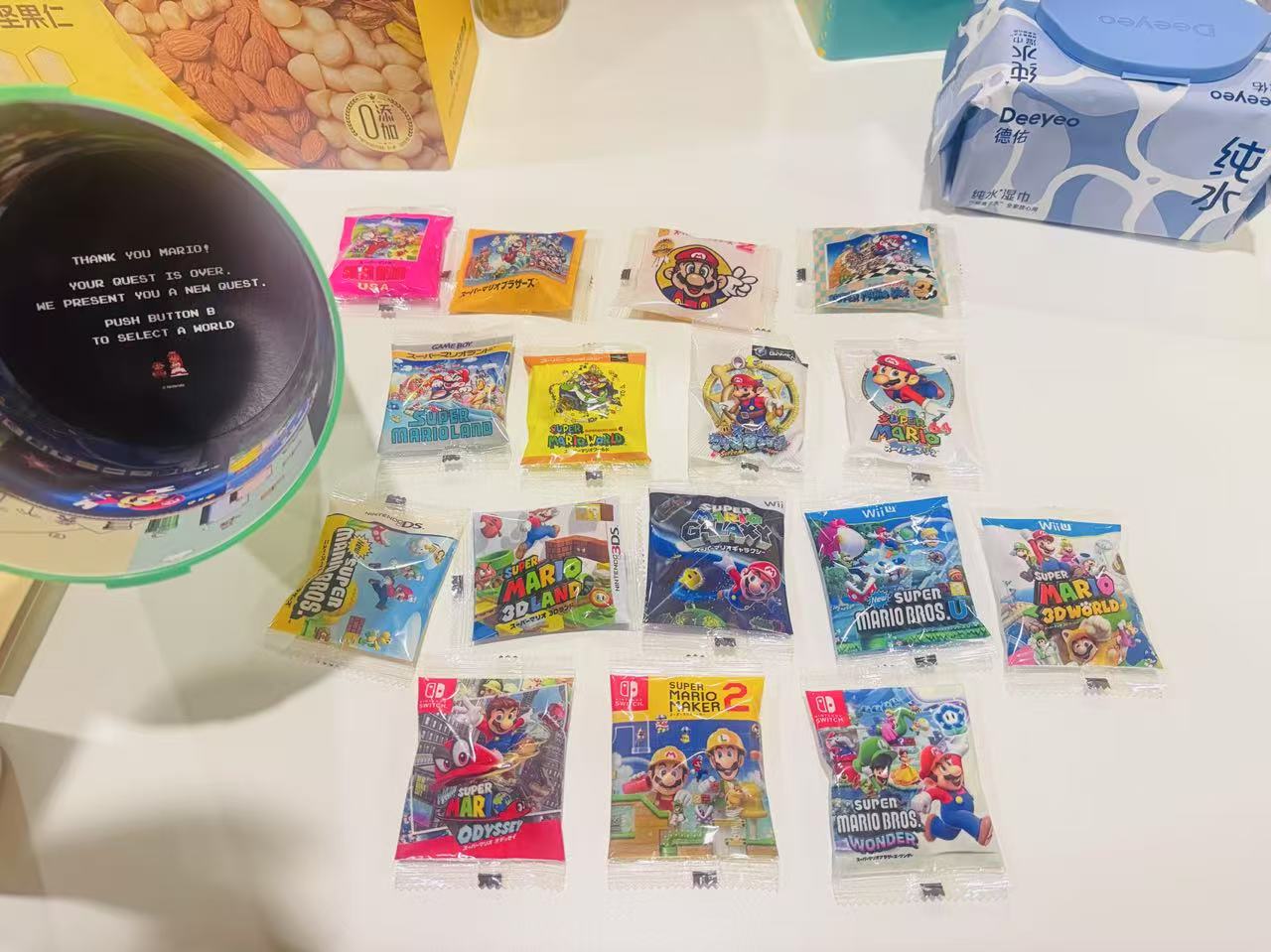 带回来的印有每一代马里奥游戏的任天堂饼干(我们尝试按照记忆排了下顺序,貌似还是不太对):
