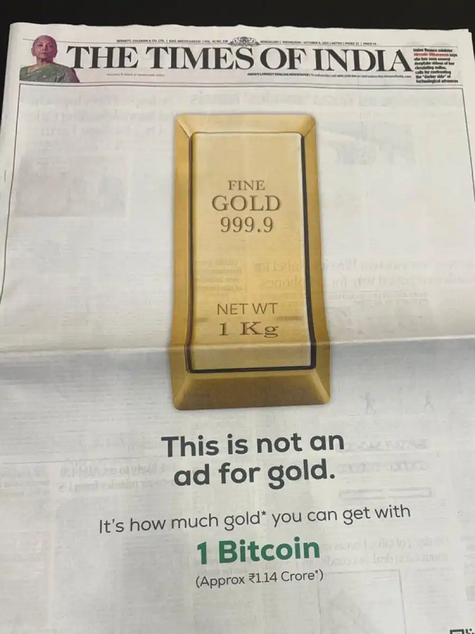 比特币广告登上印度最大的报纸「印度时报」头版。广告内容为一张 1 公斤的金条图片,并配文:「这不是黄金的广告,这是用 1 枚比特币可以兑换的黄金。」