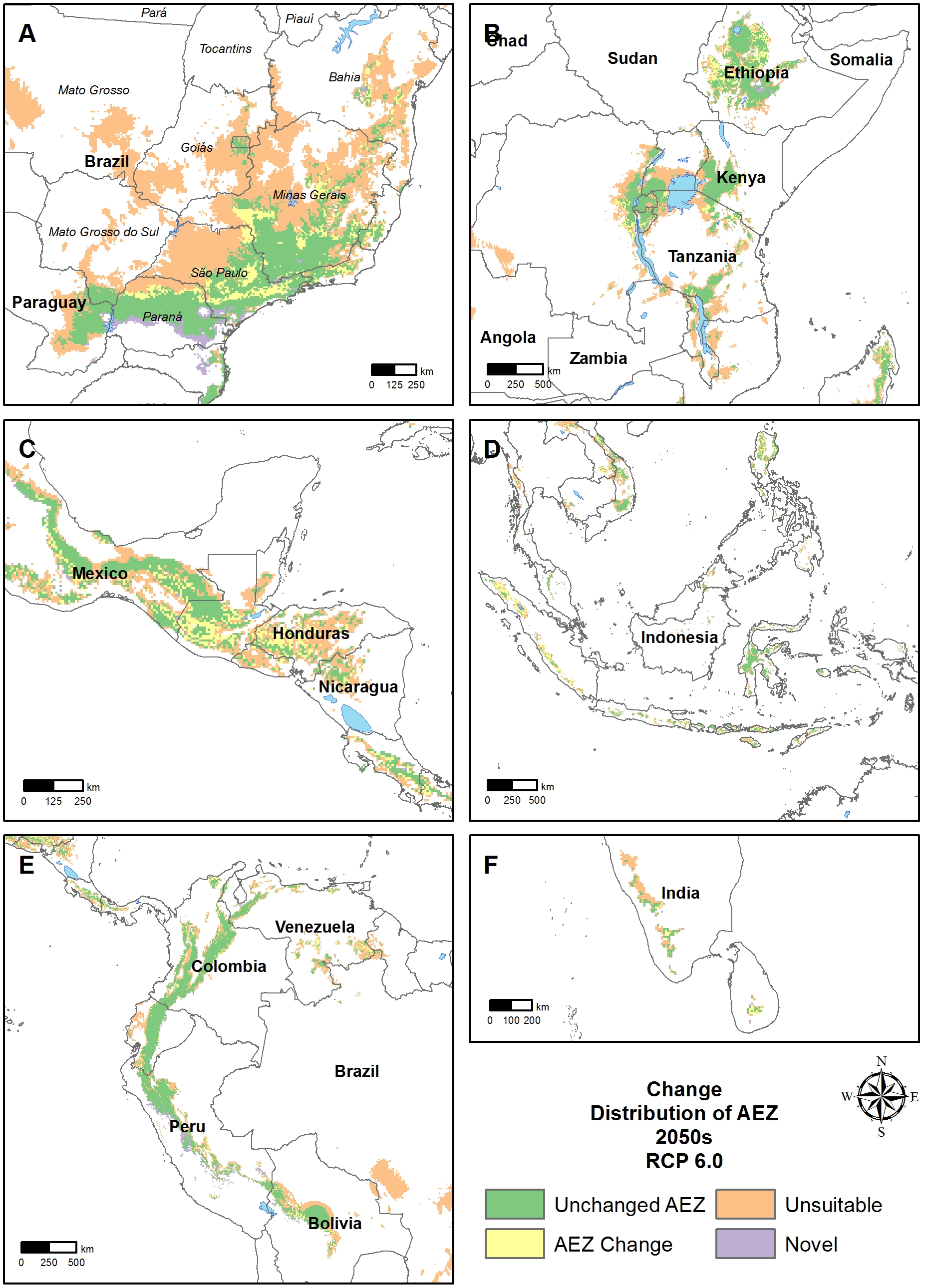 研究人员绘制的几大核心咖啡产区在2050年适宜种植区域的变化: