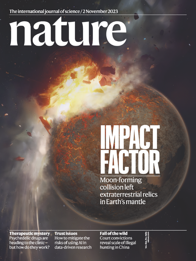 本期中提到的研究Moon-forming impactor as a source of Earth’s basal mantle anomalies发表在2023年《自然》当期封面上。