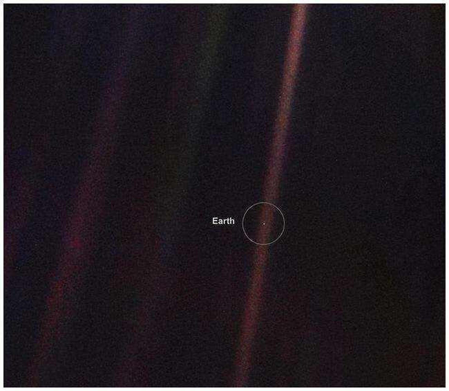 这张照片拍摄于1990年2月14日。地球沐浴在太阳光中,仅占0.12个像素,犹如一粒灰尘。